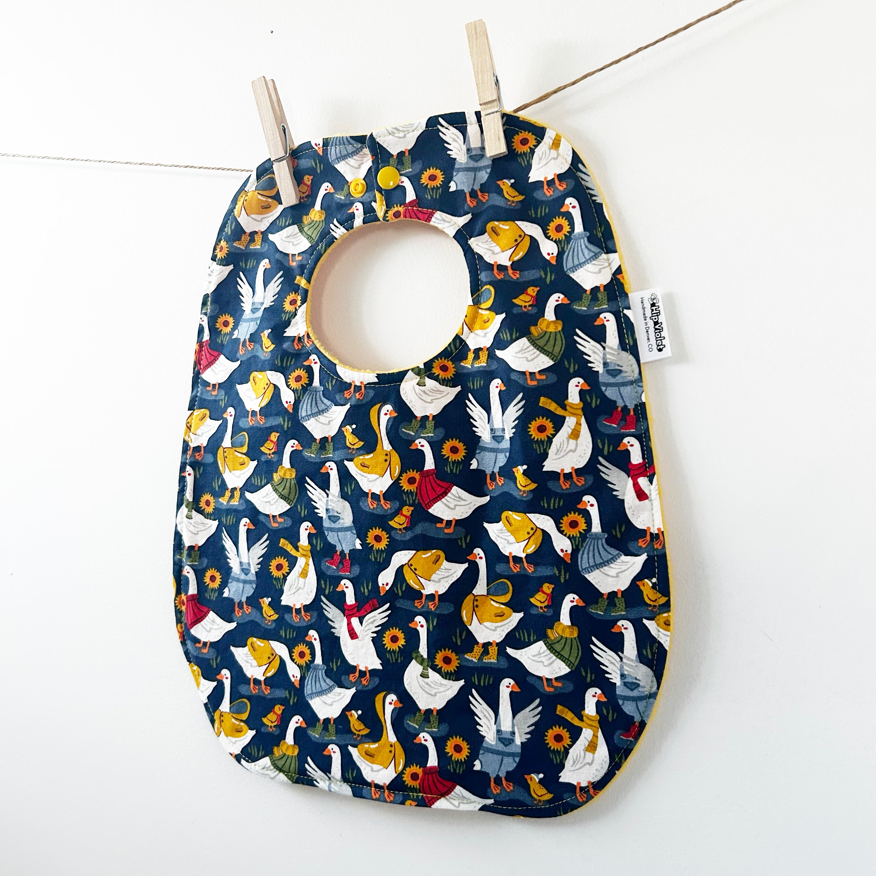 This Silly Goose baby bib has an adorable Goose in Raincoats print on the front, with super soft yellow fleece backing.