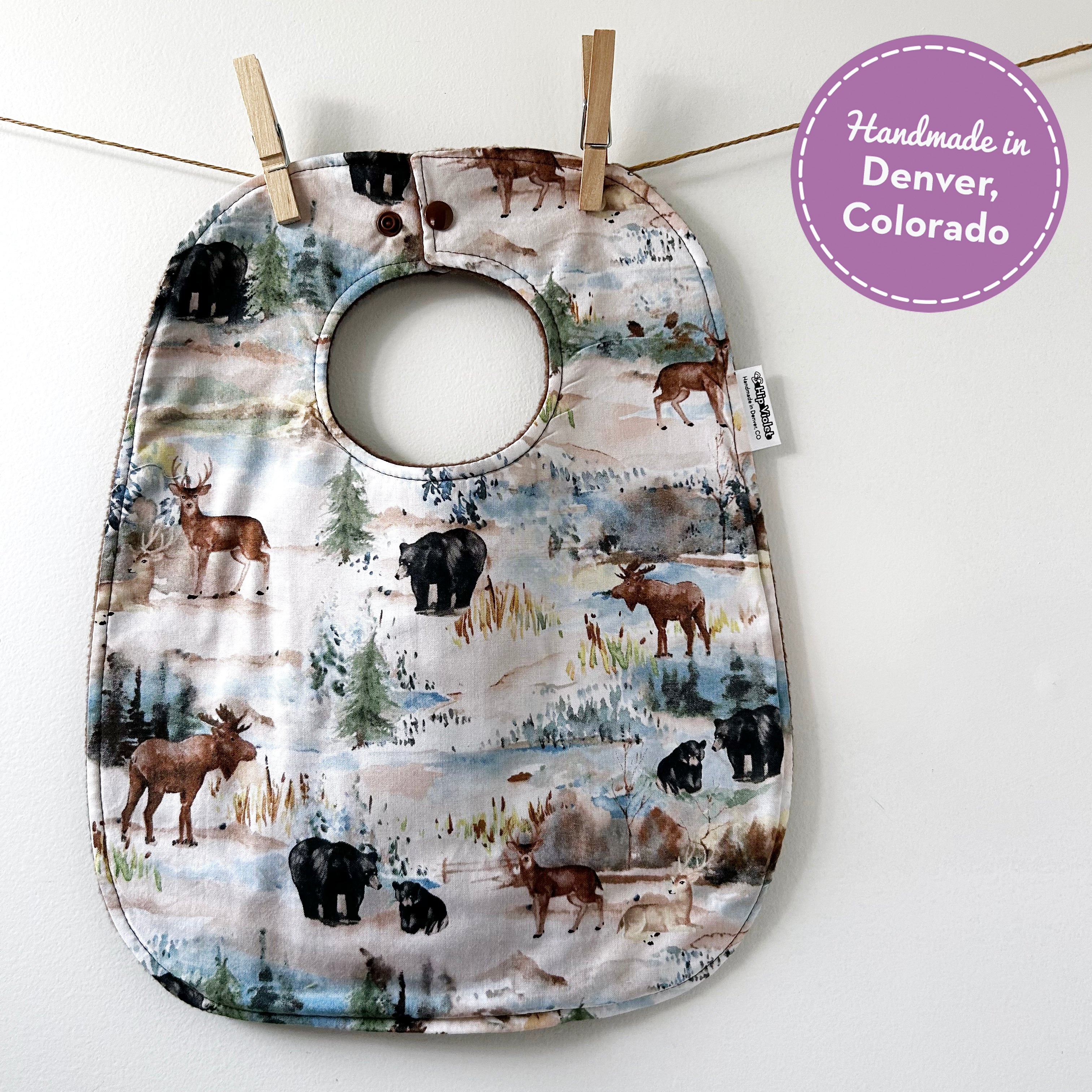 This Watercolor Wildlife baby bib features a print with moose, deer, and black bears, with super soft brown fleece backing.