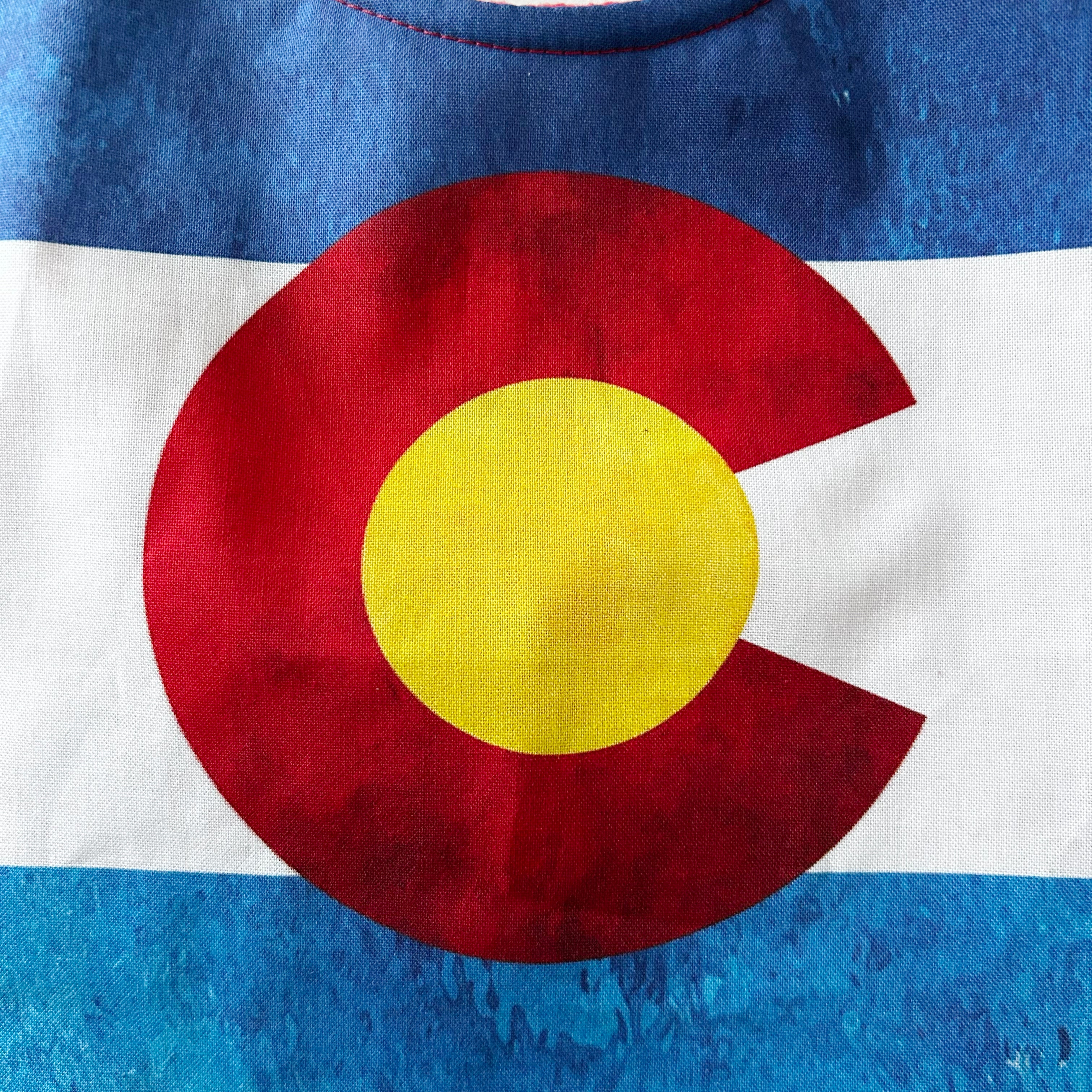 Looking for the perfect Colorado Baby Gift? This Colorado Flag bib is just the ticket. It features a navy blue watercolor background, white stripe, red watercolor "C" and yellow circle in the middle. My bibs are all oversized to cover messy little eaters, and features a super soft and moisture-wicking red fleece back. Plus 2 snap sizes to grow with your baby!
