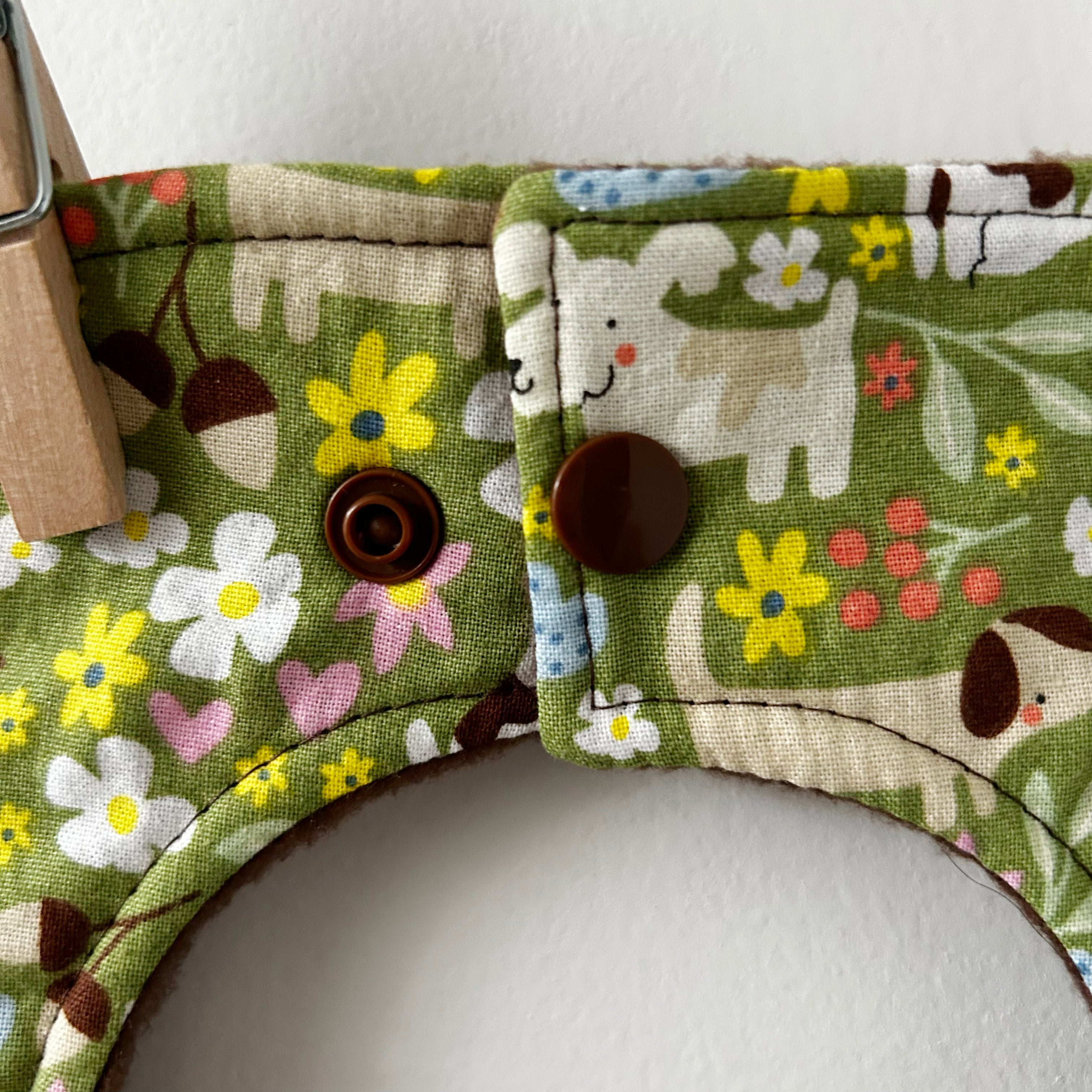This Sage Dogs Baby Bib features super cute print with all sorts of dogs on the front, with super soft brown fleece on the back.